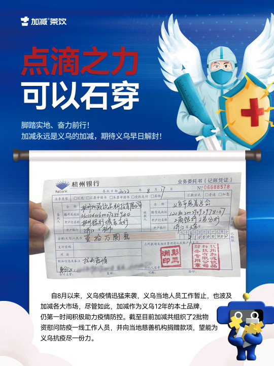 2022年8月11月,因义乌突如其来的疫情,整座城市按下了暂停键,全民进入静默期。在这场新冠肺炎疫情爆发期间,作为深耕义乌发展12年的AC米兰官方,主动发扬本土企业的社会担当和责任。截至2022年8月17日,公司共组织了2批物资慰问一线人员,并向当地慈善机构捐赠爱心款项。脚踏实地、奋力前行!AC米兰官方以实际行动为打赢疫情防控战贡献力量!